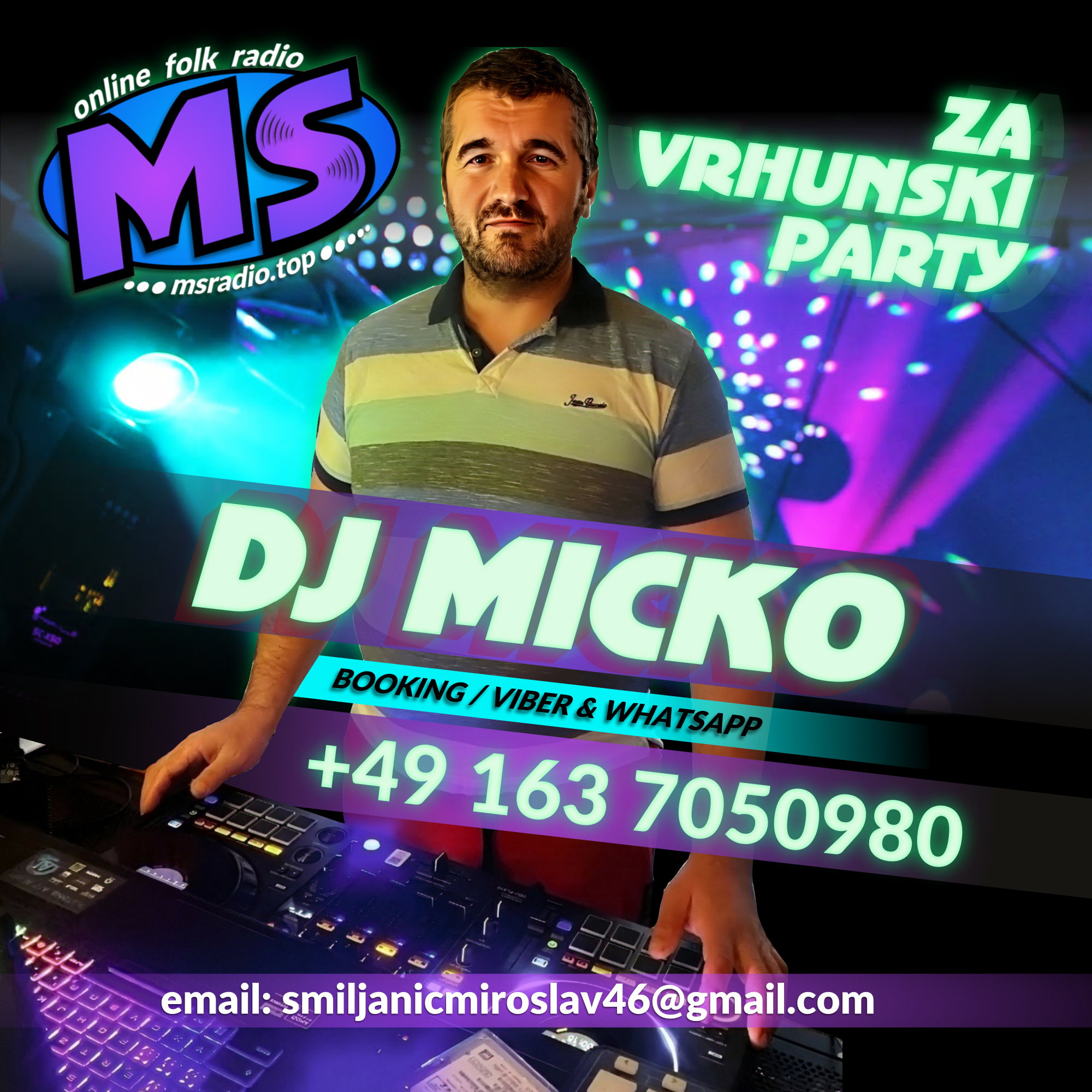 Sa vama je DJ MICKO, a na talasima MS Radija možete uživati u narodnoj, folk i komercijalnoj muzici, kao i najvećim hitovima. Svake noći, od ponoći pa do jutra, prepustite se zvucima dobrih starih hitova !